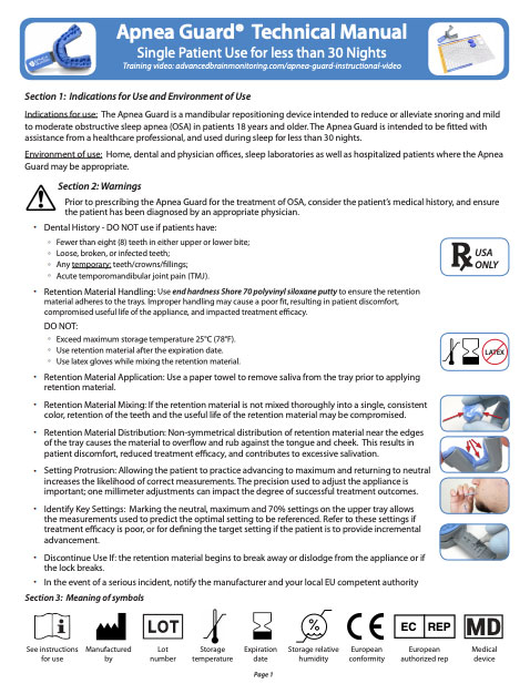 Apnea Guard是一种获得专利的非定制口腔矫治器,任何受过训练的健康专业人员都可以在不到15分钟的时间内安装,最多可佩戴30晚。该专利设计利用舌头大小和性别的组合来选择表型特征,从而获得优于传统定制口腔矫治器的治疗效果。